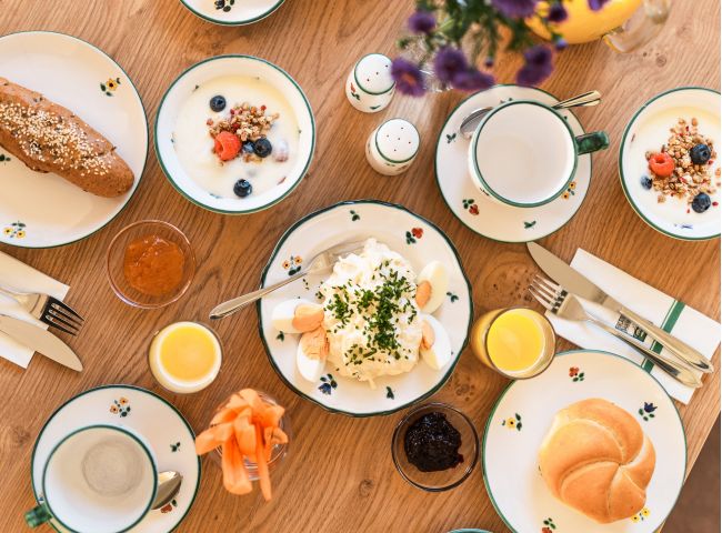 Von 08:00 bis 10:00 Uhr erwartet Sie unser liebevoll angerichtetes Frühstücksbuffet. Freuen Sie sich auf eine vielfältige Auswahl an regionalen Spezialitäten, hausgemachte und frisch zubereiteten Köstlichkeiten – alles, was das Frühstücksherz begehrt. Ob herzhaft oder süß, leicht oder deftig – hier findet jeder seinen perfekten Start in den Morgen.