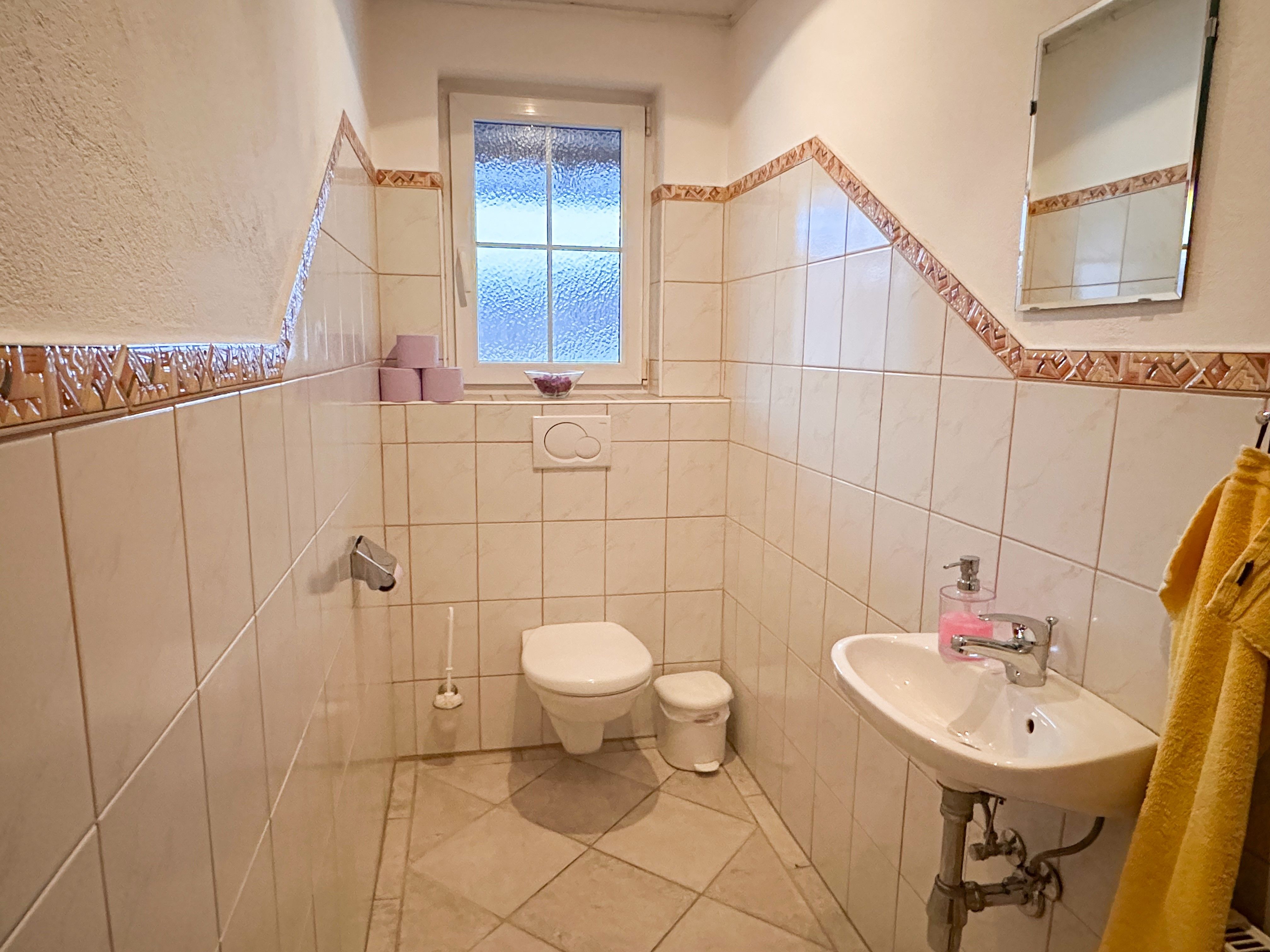 1 Bad mit Dusche, Badewanne, Waschtisch und Föhn, 1 separates WC